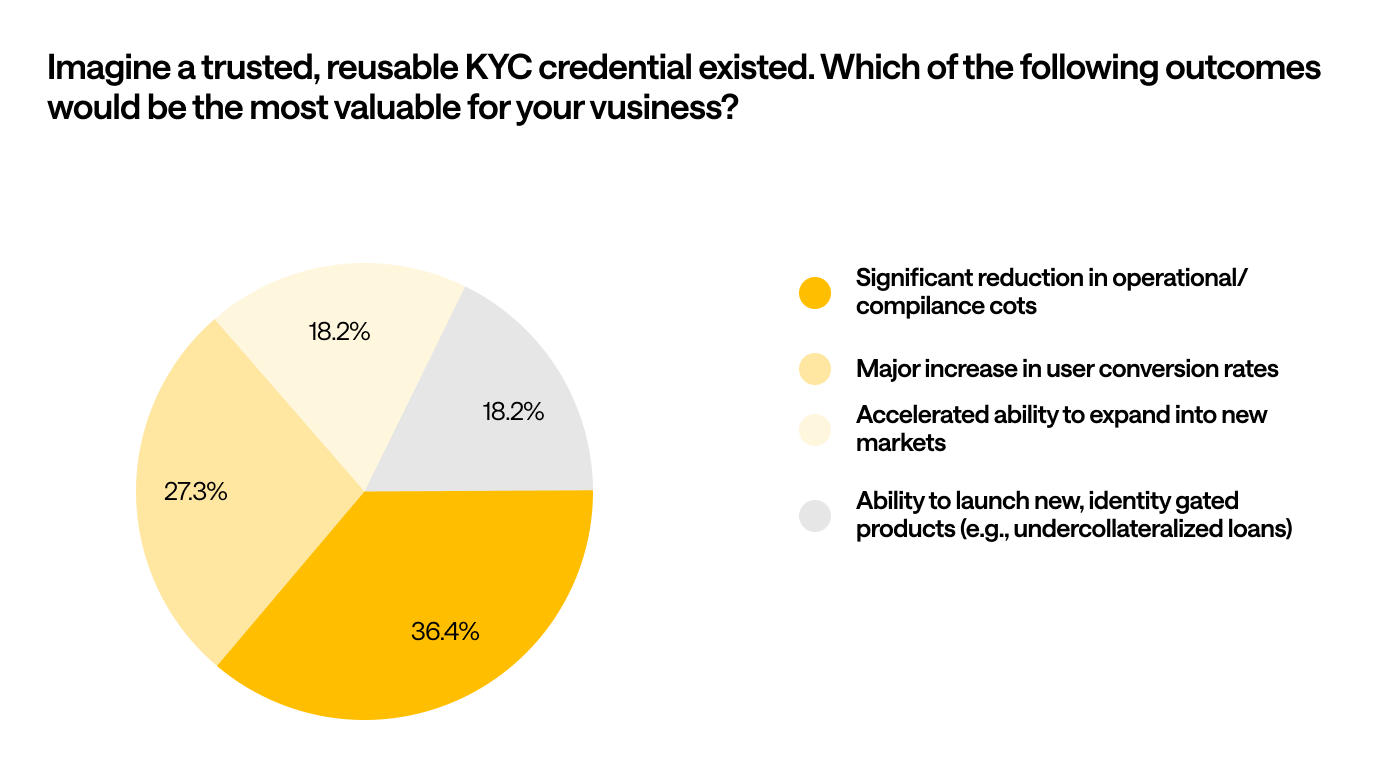 While the fears and needs are primarily around the user experience and security, the solution the market is asking for is one that directly impacts their bottom line. When asked which of the outcomes would be most valuable if a trusted, reusable KYC credential existed, the answers focused on cost savings and driving better conversion rates:
