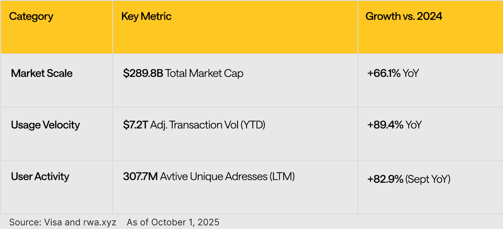 The long-forecasted Internet of Money is no longer a distant vision; it is a present-day reality. As of 2025, a parallel financial system is operating at scale, with its own assets, networks, and userbases. The sheer scale of this new economy is remarkable. Onchain stablecoin transaction volume has already surged past $7.2 trillion by October 2025, a figure that demonstrates growing re-platforming of global value transfer. Likewise, stablecoin market capitalization has expanded 66.1% YoY, reaching $289.8 billion.