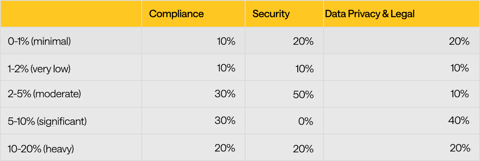 Moreover, listing current cost splits between compliance, security, and data privacy and legal cost, the data shows that security is the most consistently high-priority expense among the respondents. However, all three categories represent significant costs with a large portion of companies allocating 5% or more of their total operational budget to each category.